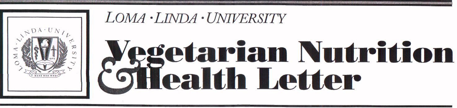 Subscriptions USA: $24 per year, Canada: US$34 per year, Foreign: US$ 44 per year Customer and Subscriber Services 1171 Nichol Hall, School of Public Health, Loma Linda University, Loma Linda, CA 92350 Editorial Correspondence Vegetarian Nutrition and Health Letter 1171 Nichol Hall, School of Public Health, Loma Linda University, Loma Linda, CA 92350 e-mail: vegletter@sph.llu.edu Vegetarian Nutrition & Health Letter is published 10 times per year by Loma Linda University. |